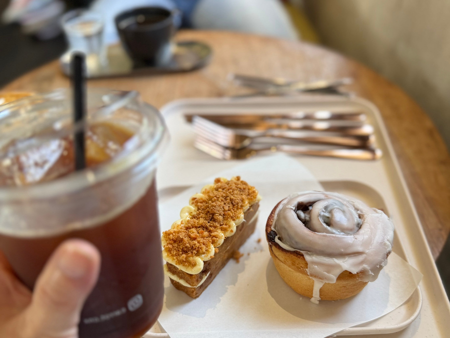 호텔에서 택시를 타고 캐롯커피에서 커피와 디저트를 먹고
