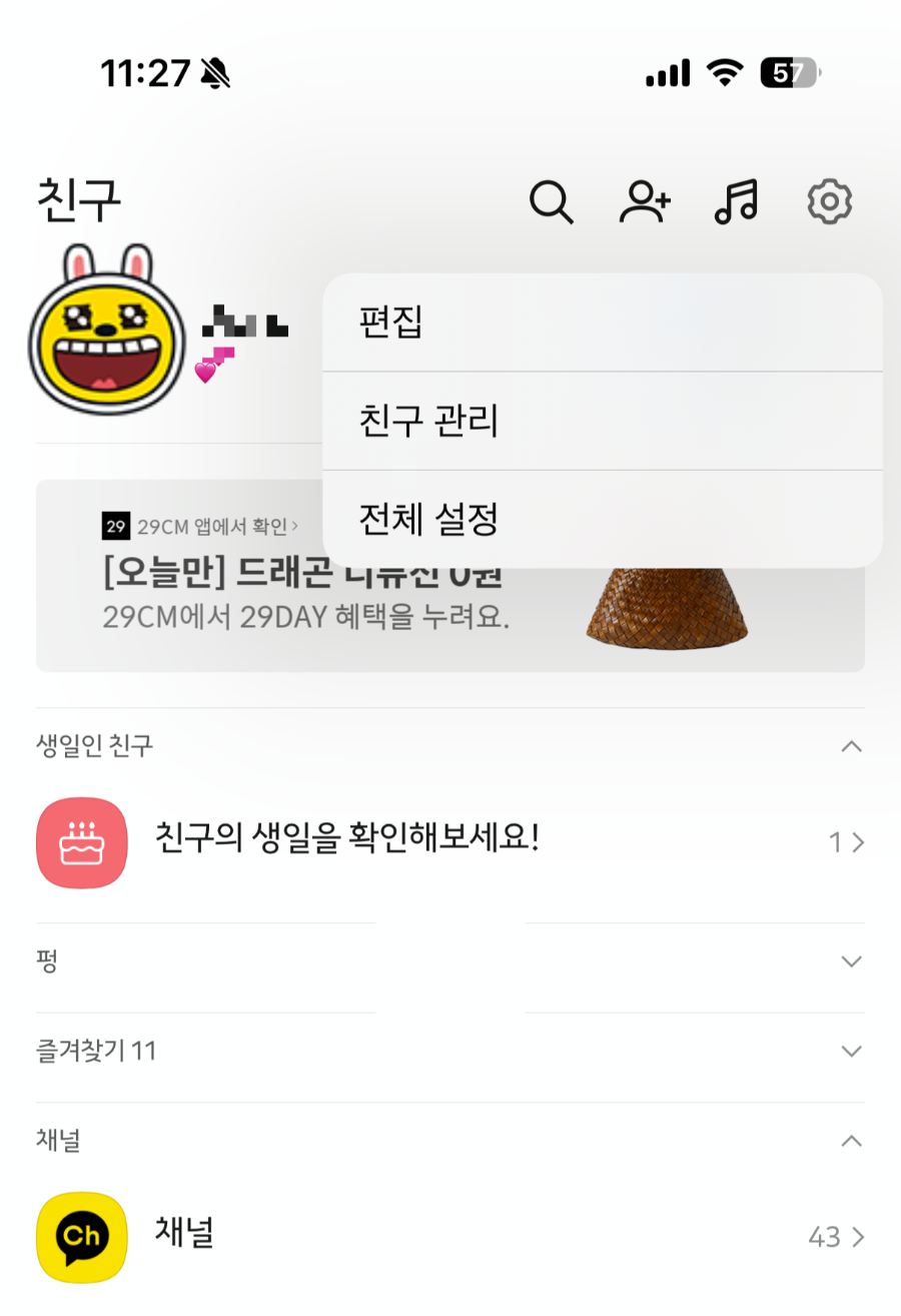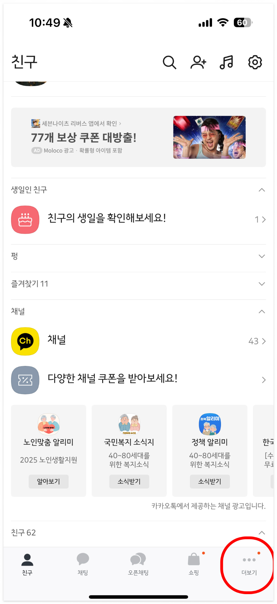 1) 카카오톡을 실행한 후 오른쪽에 있는 점 세 개를 눌러 더보기 화면으로 이동