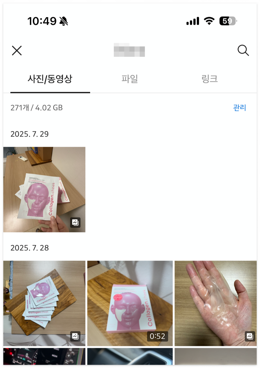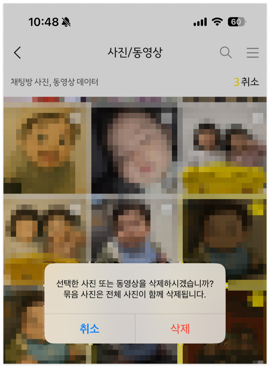 3) 사진/동영상 버튼을 누른 후 데이터를 삭제하고 싶은 채팅방을 선택. 해당 채팅방에서 주고받은 사진과 동영상이 나타남