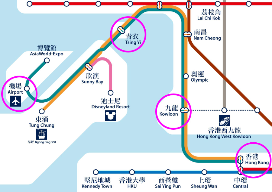 공항철도 AEL은 공항을 출발하여 칭이(TsingYi)역, 구룡(Kowloon)역, 홍콩(HongKong)역 총 3개 역에 정차를 합니다.